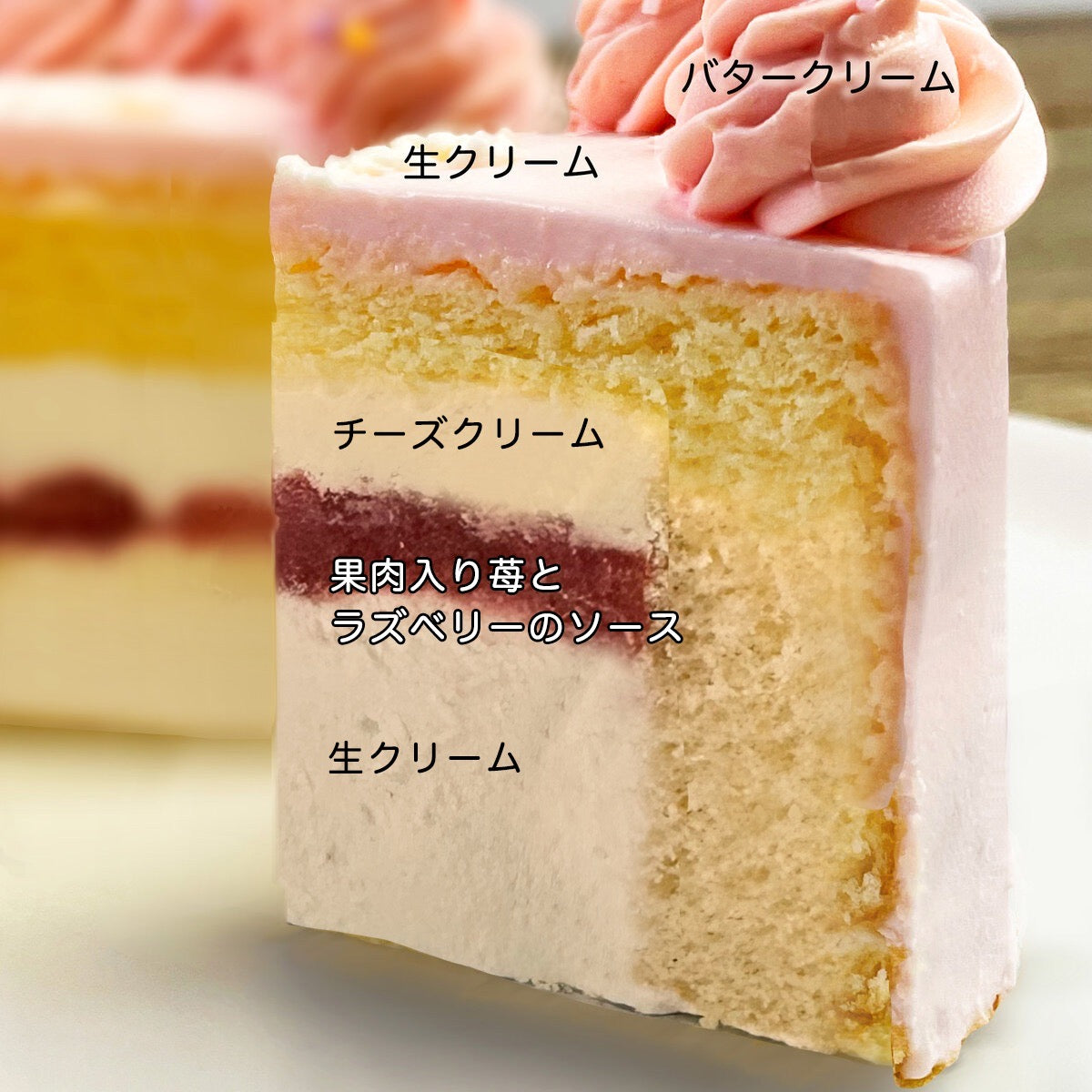 ■ケーキの中身は、上から生クリーム・角切りの莓・苺とラズベリーのソース・レアチーズの層をスポンジでサンドしています。